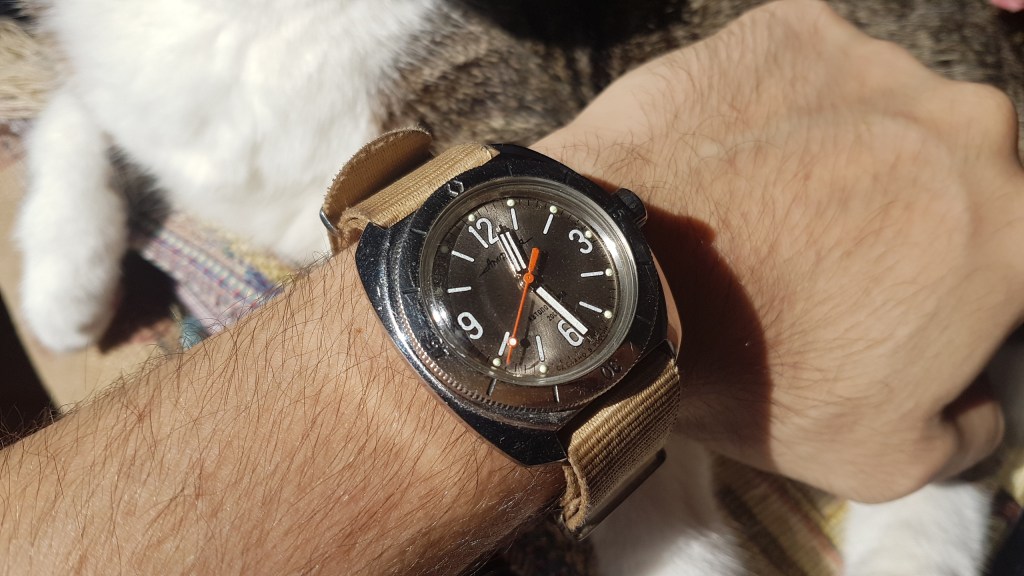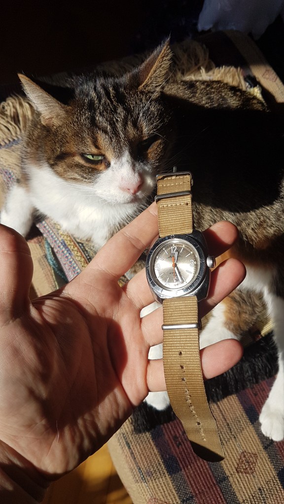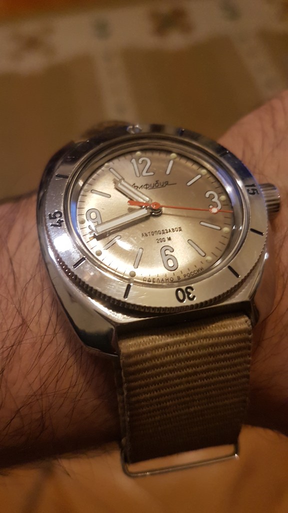Aldığım Vostok’larda benim öncelikli düşmanım çıtırdamayan bezel değil dahili epilasyon mekanizmalı bilezikleriydi. Ucuz hissettirmek bir yana benim için her anı eziyete dönüştürüyordu, köprü boyu 22mm olduğu için zevkime uygun kayışlarla kullandım. Şimdi de üzerinde “NATO” palaska kordon mevcut.